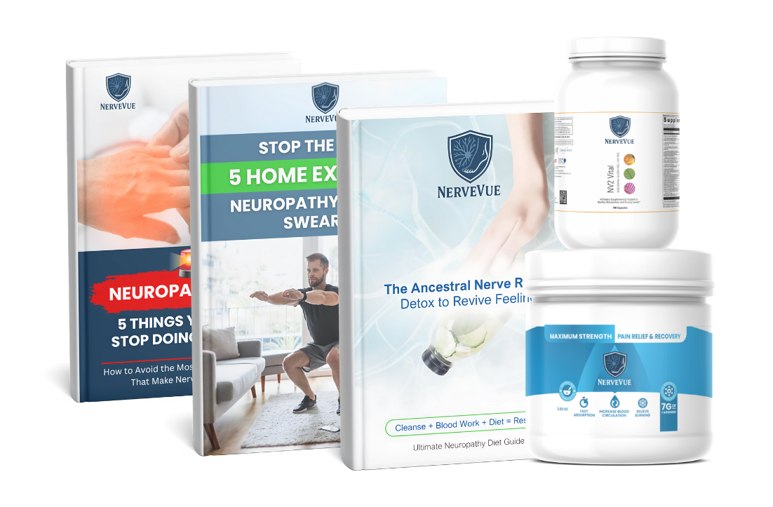 The NerveVue Bundle is a complete at-home protocol for relieving neuropathy symptoms by supporting circulation, reducing inflammation, and restoring nerve health from the inside out. It includes our LED light therapy device, neuropathy relief cream, three physician-selected supplements, and our signature 90-day detox and lifestyle manual—all developed under the guidance of leading neuropathy experts.